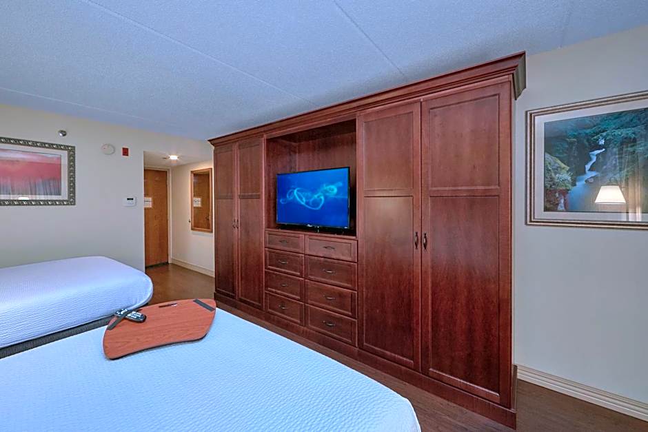 This room includes a small table with 2 chairs and a private bathroom with granite countertops.